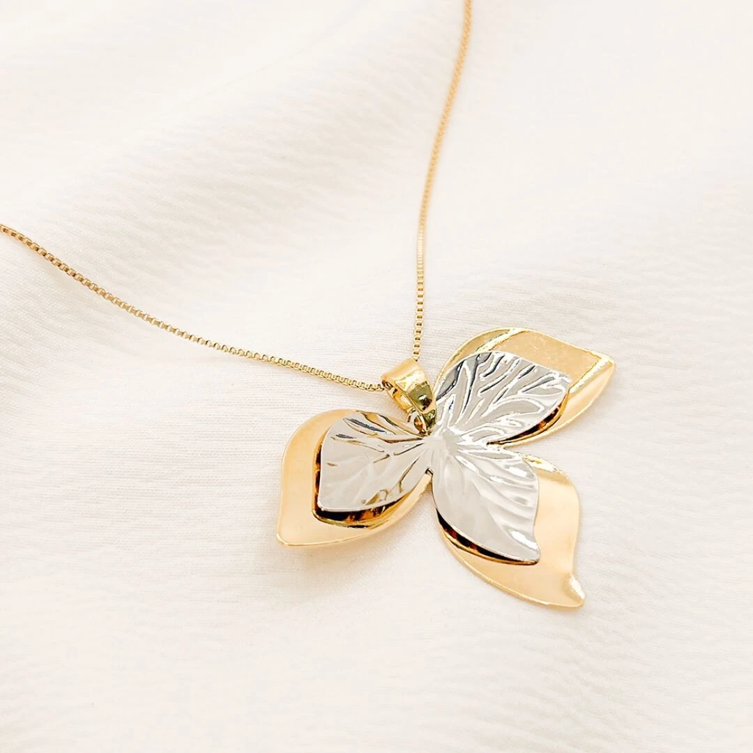 Tem corrente veneziana, pingente flor com 4,5cm x 2,6de comprimento, folha lisa 4,3cm x 2,6cm e folha trabalhada 3,2cm x 2cm, fechamento com lagosta e plaquinha BOA.