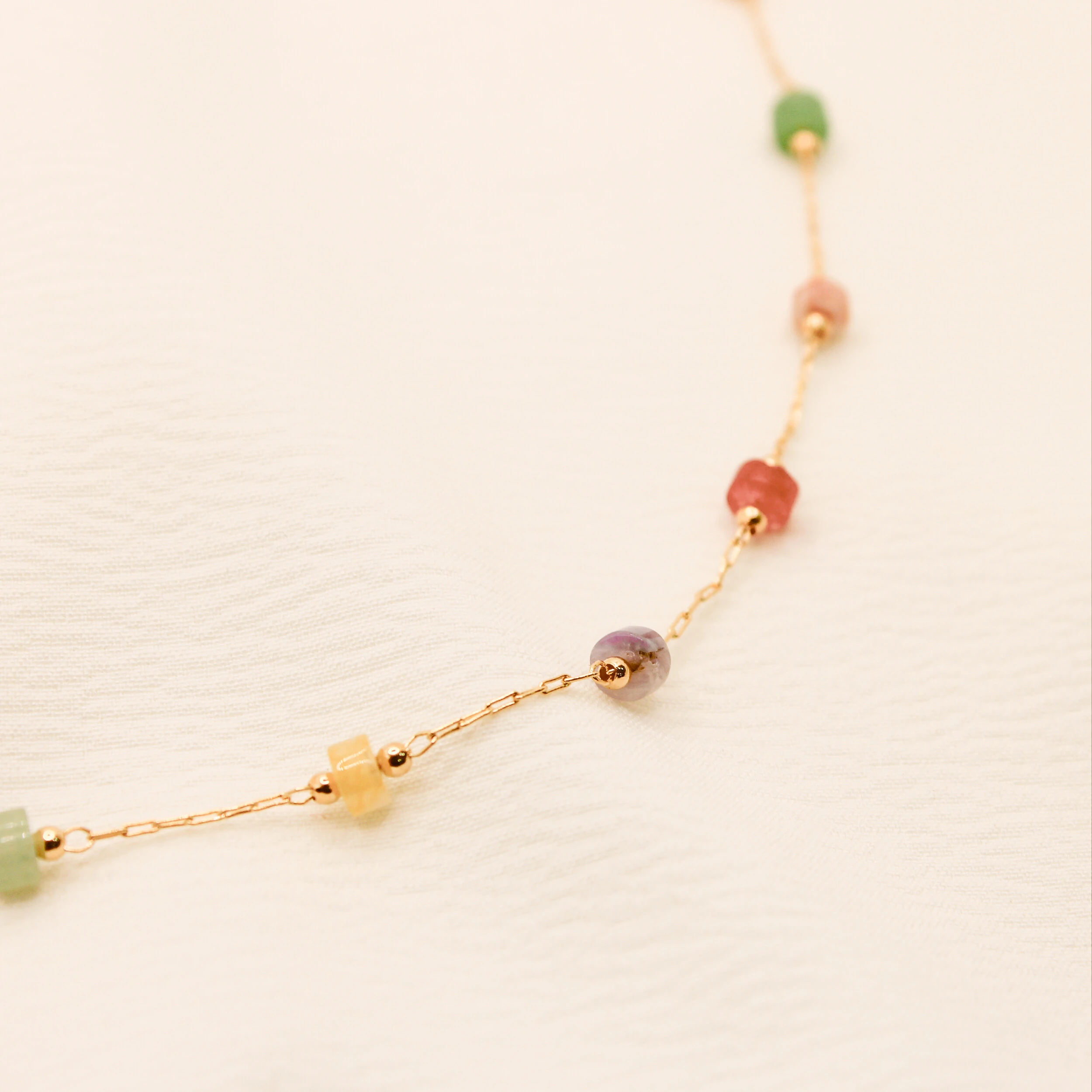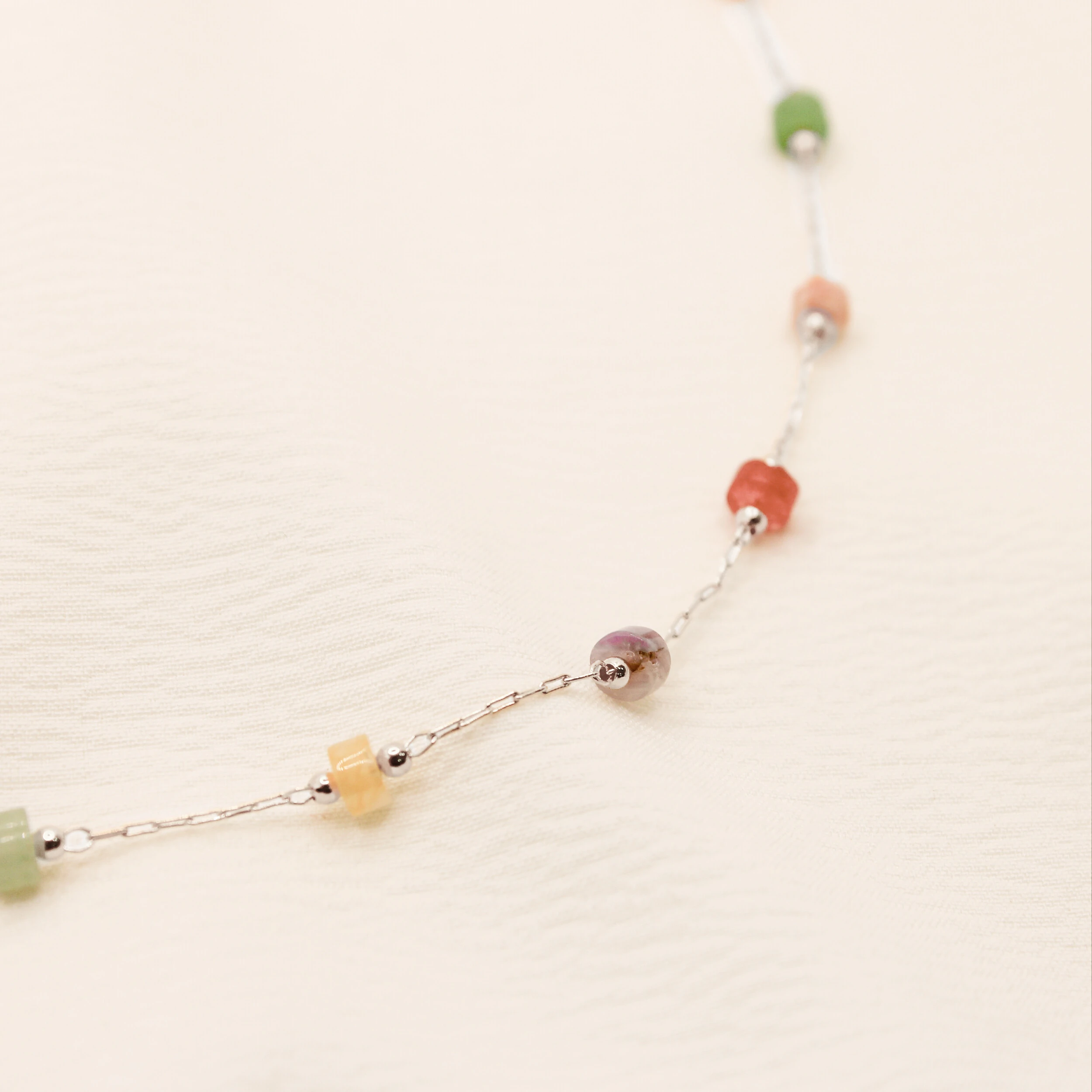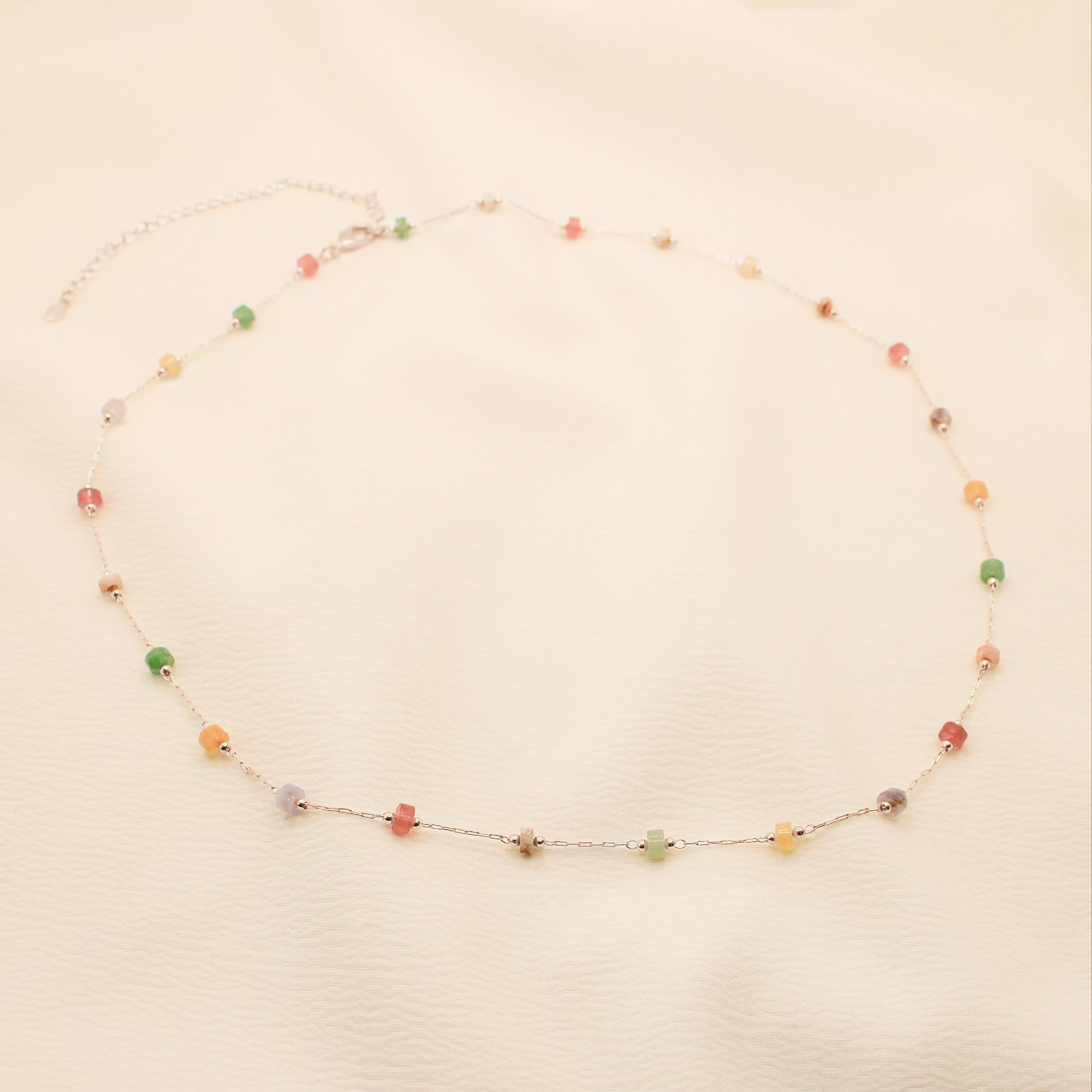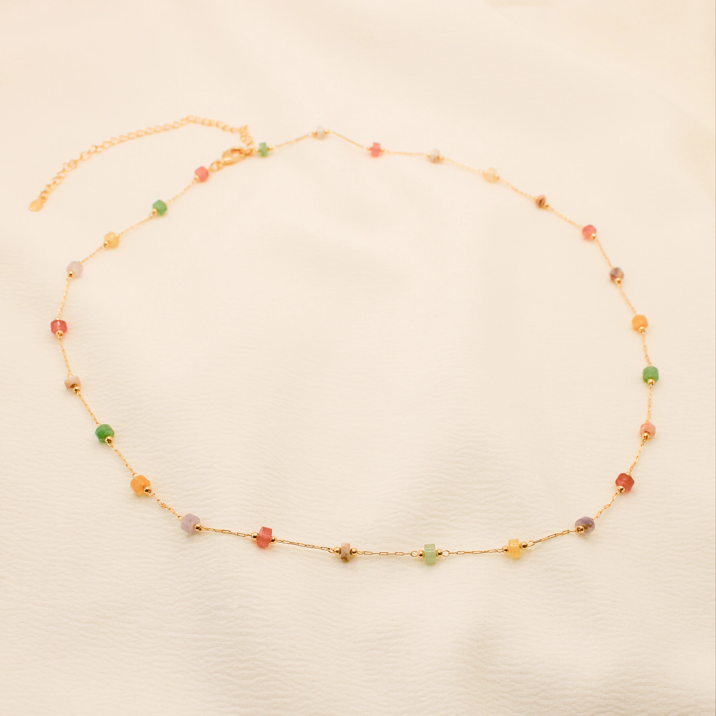 Com cristais redondos em tons vibrantes e harmoniosos, este colar transmite energia positiva e estilo autêntico, iluminando qualquer produção do básico ao sofisticado.