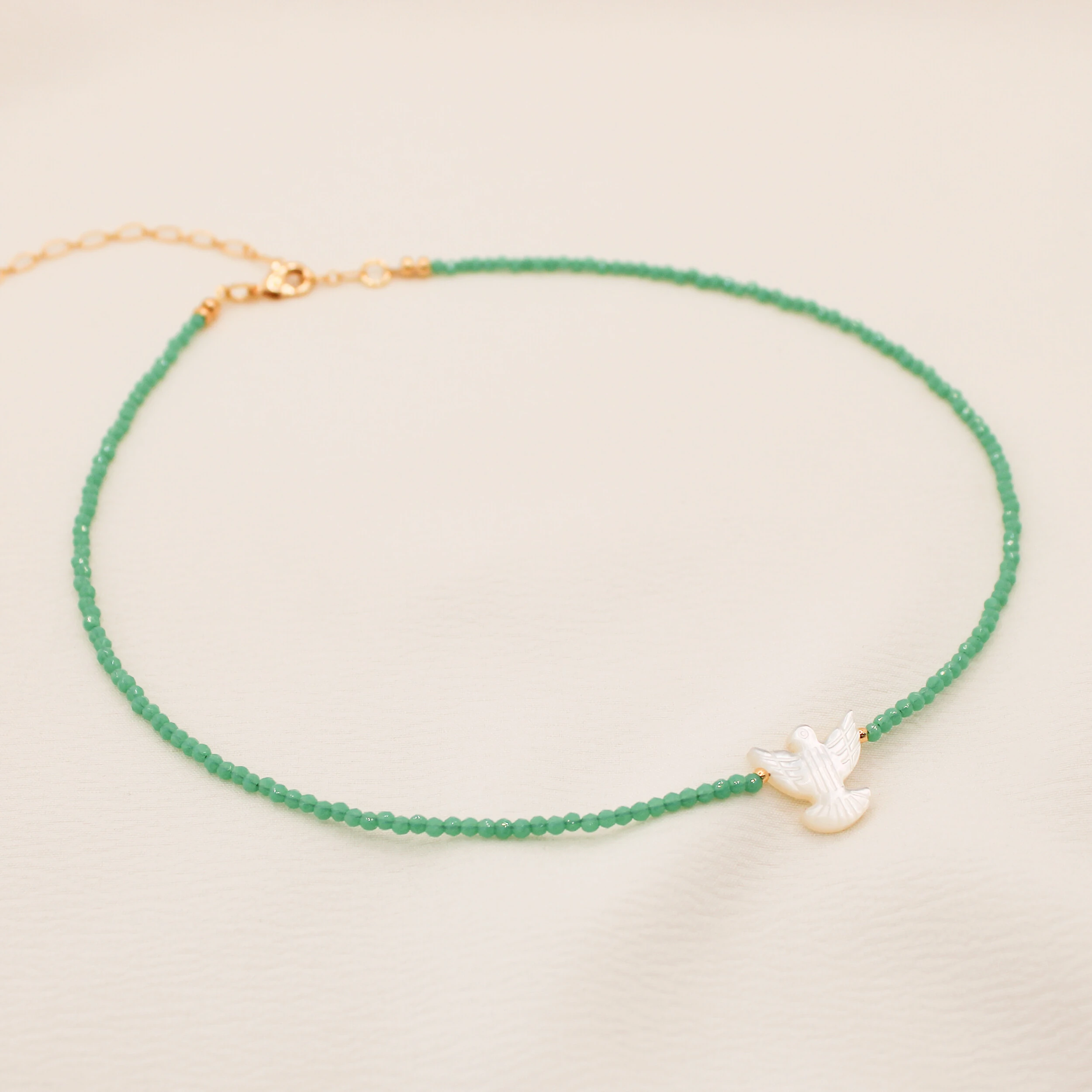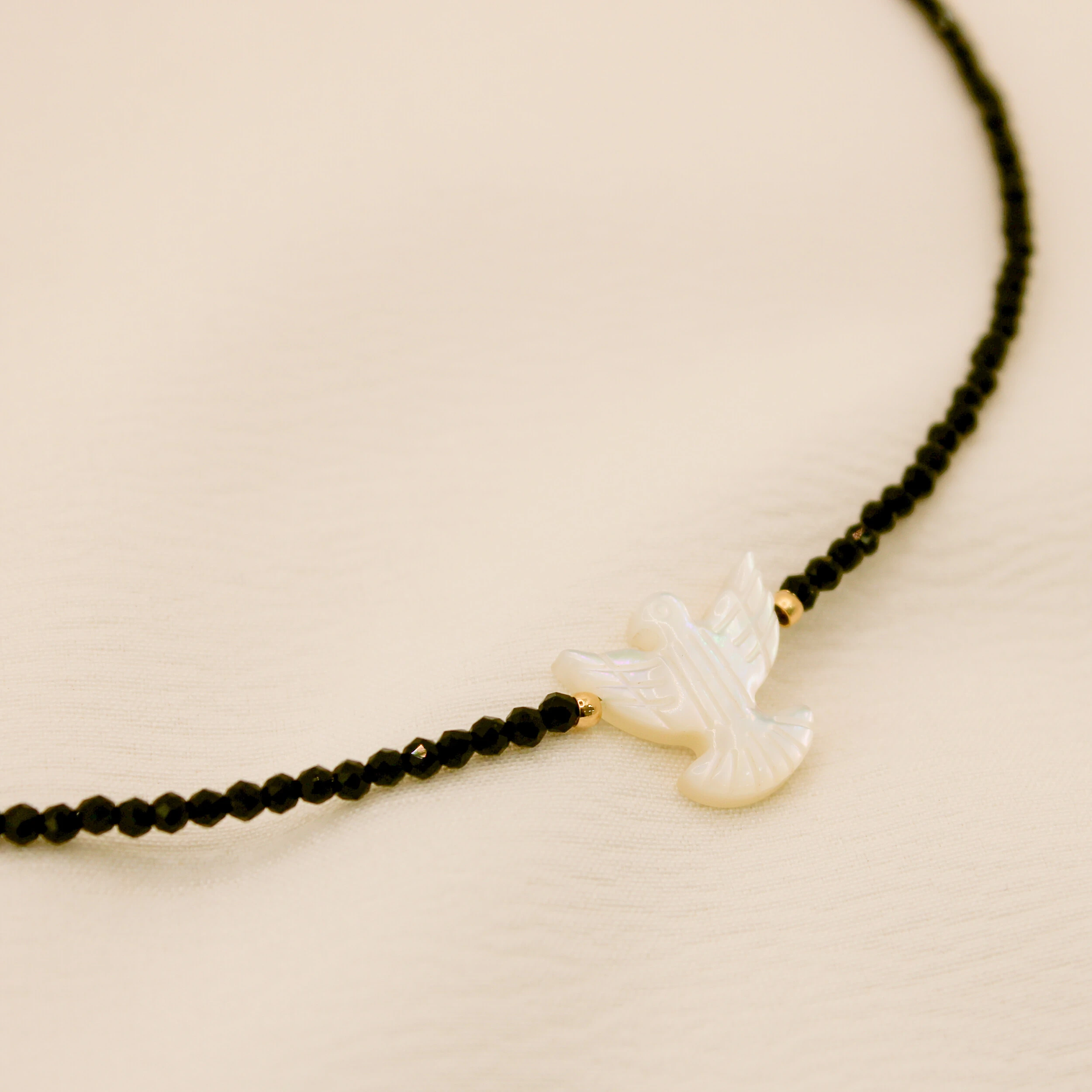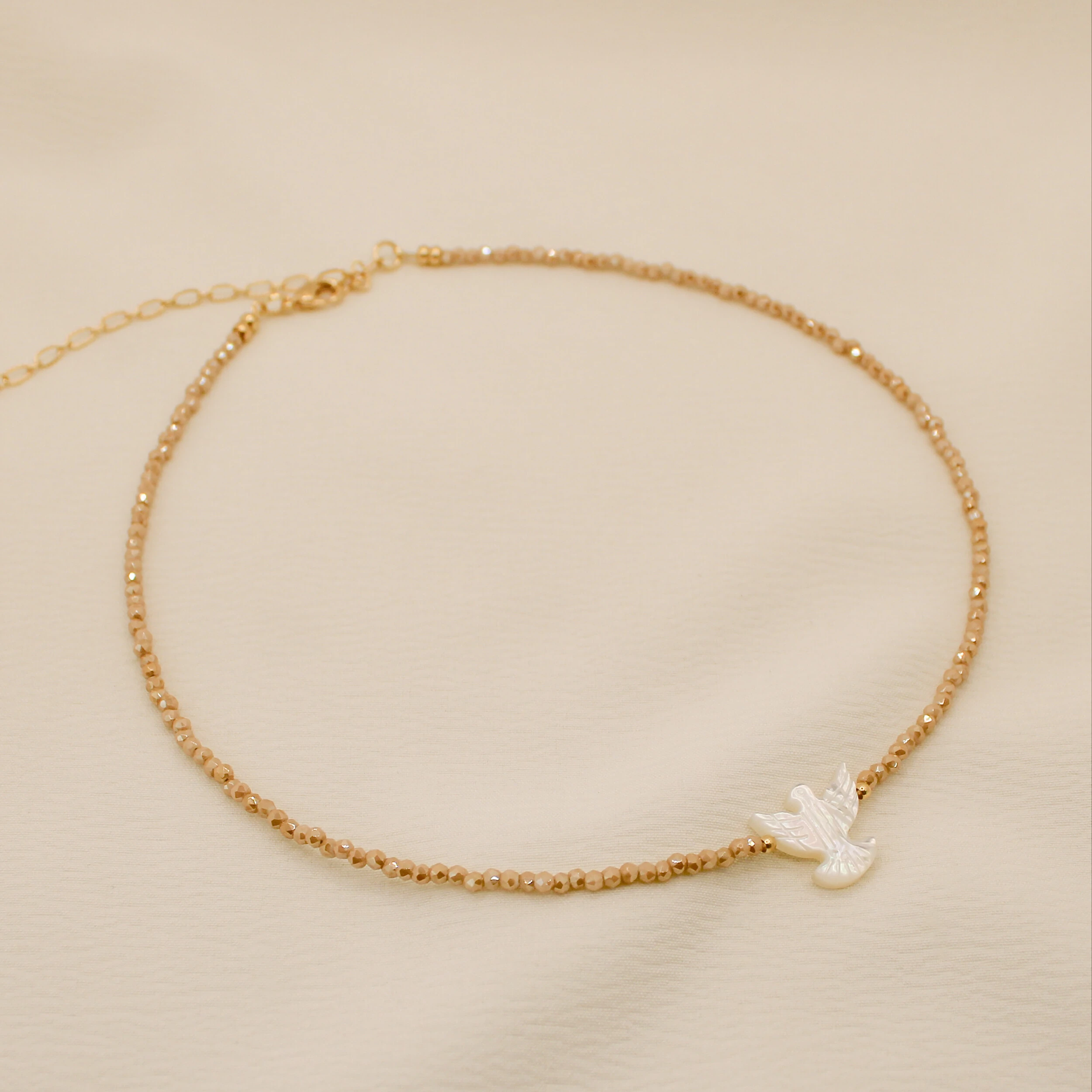 Elegante e cheio de significado, este colar une delicadeza, espiritualidade e sofisticação. Confeccionado com pequenos cristais de brilho suave, o destaque da peça fica por conta do pingente de pomba de madrepérola, símbolo de paz, proteção e harmonia.